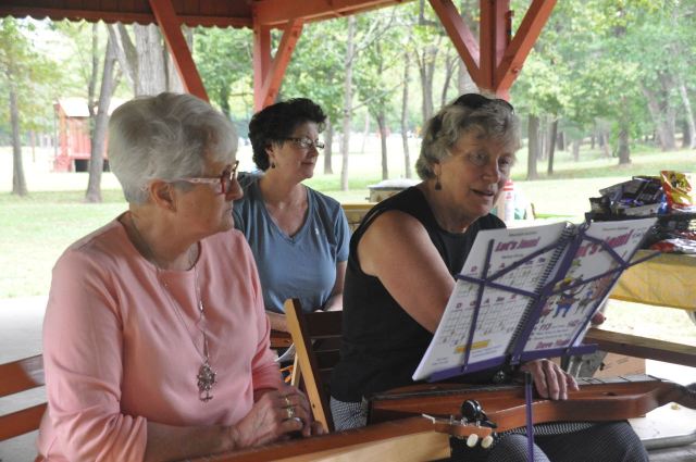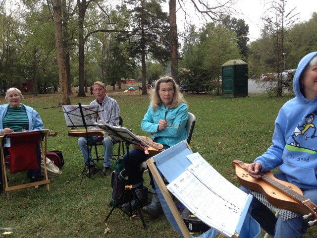 For the past several years, we have gathered for a fall jam at Grand Caverns Park in Grottoes. We have shared good food as well as good music! After an unseasonably warm week, the day of our picnic dawned chilly and remained that way! We were thankful for Mike’s crockpot of macaroni (and his red velvet cake, too!), for Joan’s spectacular salad, the ham, snack mix, and myriad of other goodies that were shared! A dozen folks were there, and the sun shone while we jammed before lunch. Thanks to Dinah for leading the slow jam!