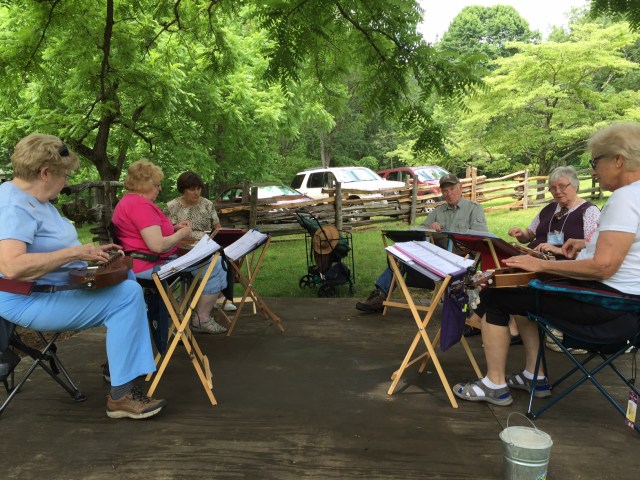 Jan and Tom Scanlan, Patricia Cash, Shannon Tate, Debbie Campbell and Carole Ralston, along with other club members, played at Humpback Rocks, Milepost 6 on the Blue Ridge Parkway, every 2nd and 4th Sunday afternoon of the summer months, June through September, weather permitting. Lots of visitors at the Visitor Center stop by to learn about the Appalachian Mountain Dulcimer and to listen to some old-time tunes. We met visitors from many states and several other countries. Perhaps the most memorable visitors, however, were the black bears. The music must have been to one of the bear’s liking – he came back another Sunday to hear some more!
